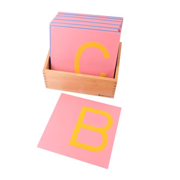 26 sandpaper letters in upper case. Consonants are on pink wooden boards and vowels on blue boards. To develop a muscular impression of the letter shapes and to associate the sounds with the shapes. This also helps to develop a visual impression and to learn the writing direction of the letter shapes.
